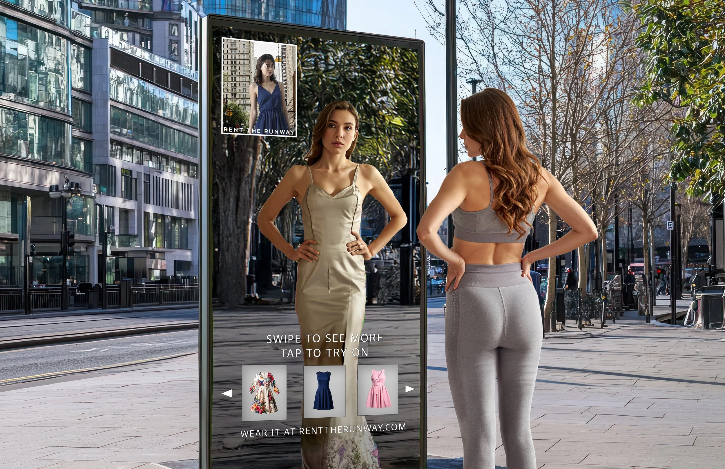 As a woman looks into an interactive billboard resembling a mirror, her outfit is transformed into a designer dress from Rent the Runway.