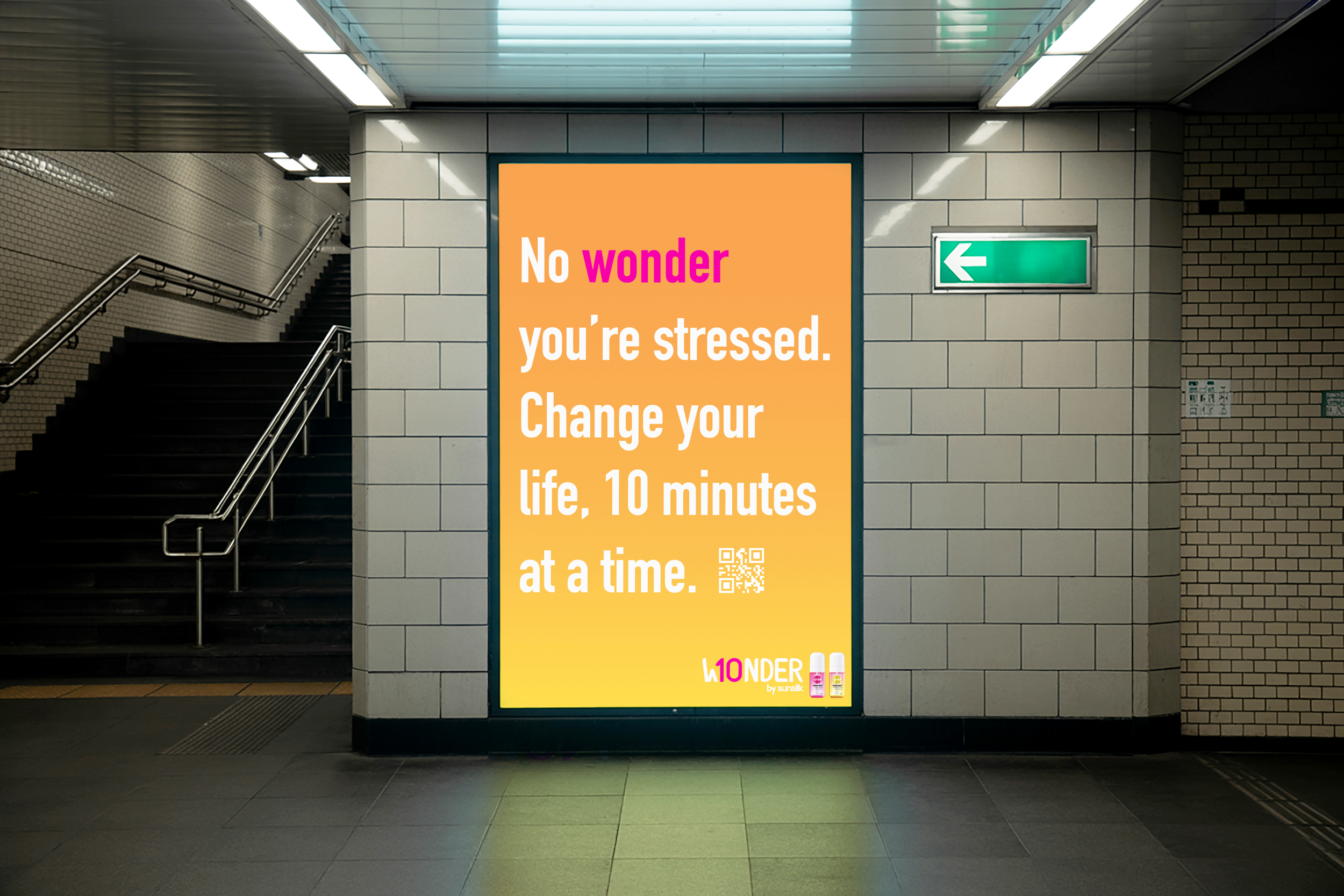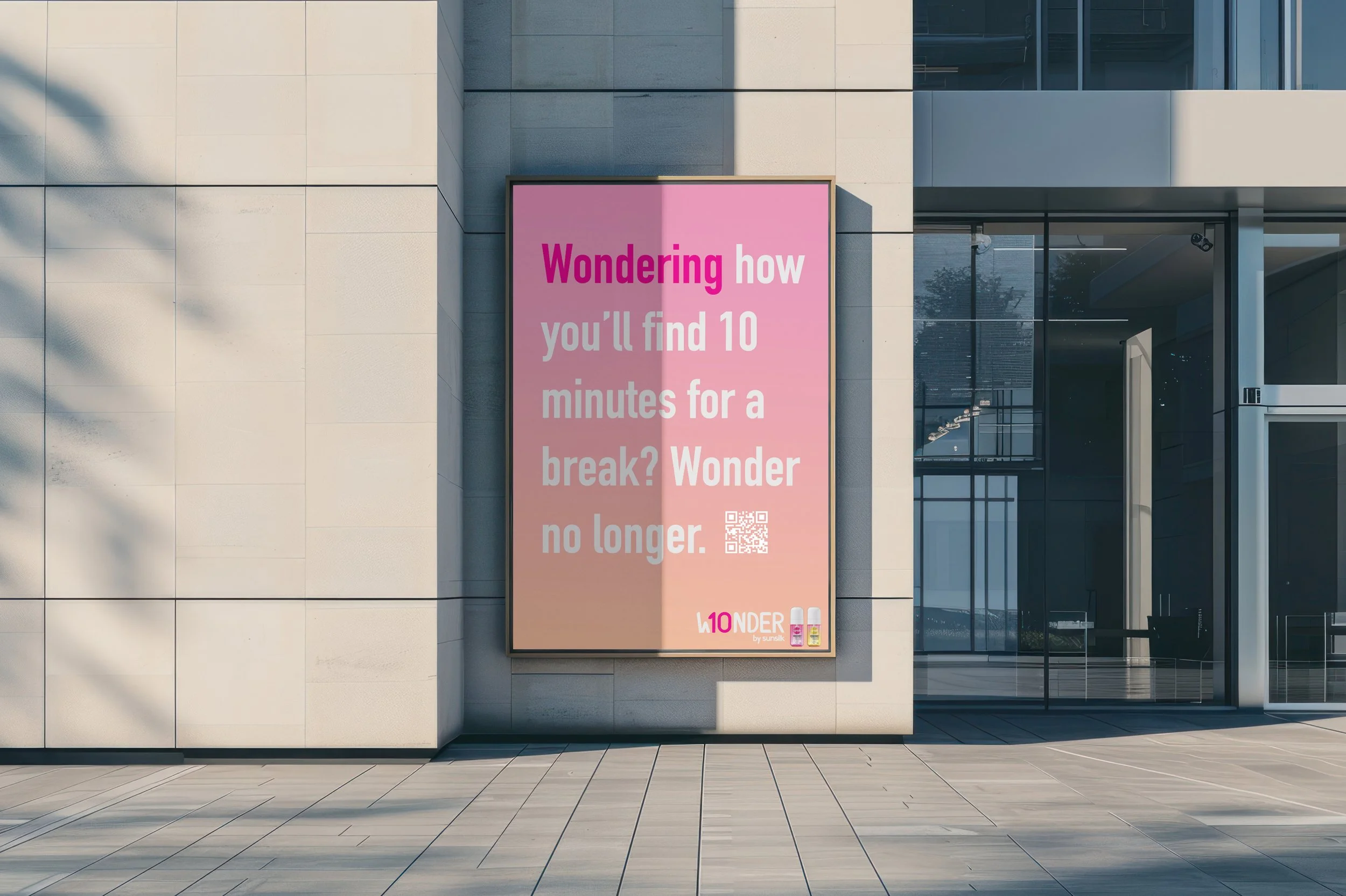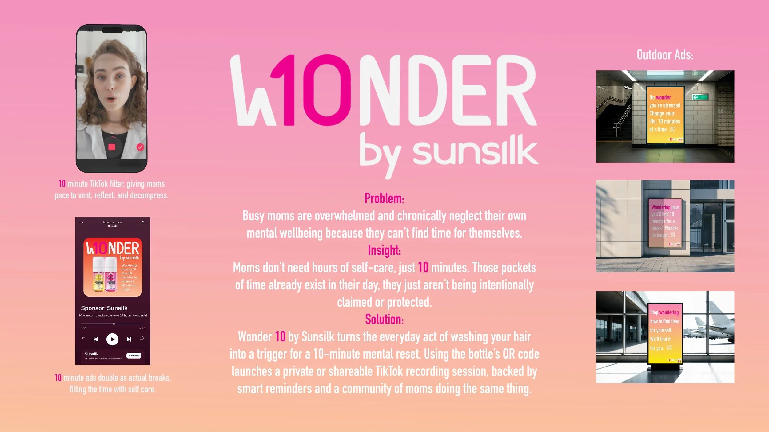 Solution: Wonder 10 by Sunsilk turns the everyday act of washing your hair into a trigger for a 10-minute mental reset. Using the bottle's QR code launches a private or shareable TikTok recording session, backed by smart reminders and a community of moms doing the same thing.